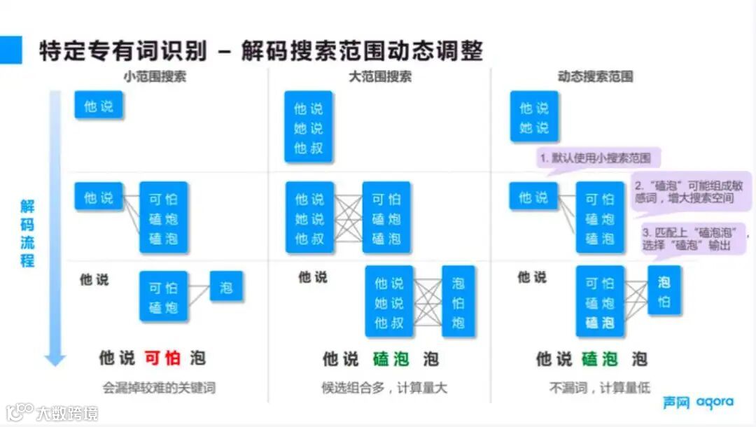 具体来说,当发现前面一个音素中可能存在违规词的时候,就对后续候选词的解码搜索范围进行扩充。这样既不会漏掉低频的违规词,同时也是可以避免对最终业务结果没有影响的计算,从而整体上大大减少计算量,保证业务的实时性。