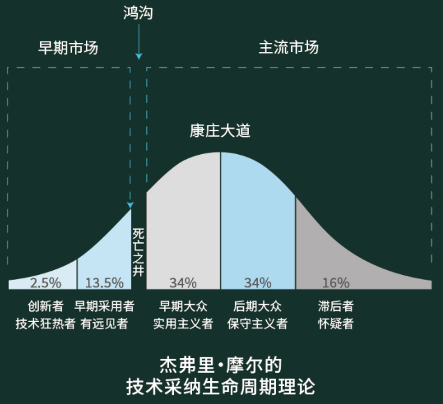 新模式和新产品的市场适配,与技术采纳生命周期有一定一致性。根据杰弗里 · 摩尔的理论,在早期市场和主流市场之间存在一个难以逾越的死亡之井。而早期入局者需要更多承担教育市场的责任,并不适合资源、资本、人才等基本盘尚不稳固的初创企业。