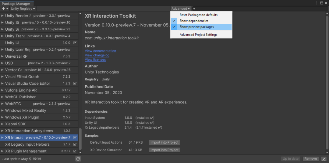 现在我们已经配置了Wave SDK,接下来需要添加Unity的XR Interaction Toolkit软件包。这将帮助我们使用Unity的XR组件,使其与场景中的Unity输入或其他元素进行交互作用。在“Package Manger”中,单击“Advanced”按钮(在搜索输入的左侧),然后启用“Show preview packages”选项。预览包可见后,向下滚动到 XR Interaction Toolkit,然后单击安装。
