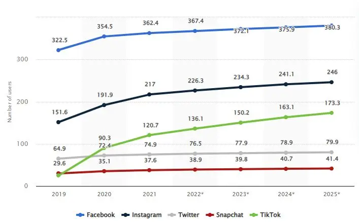 各大社媒在拉美的用户增长,图源:Statista