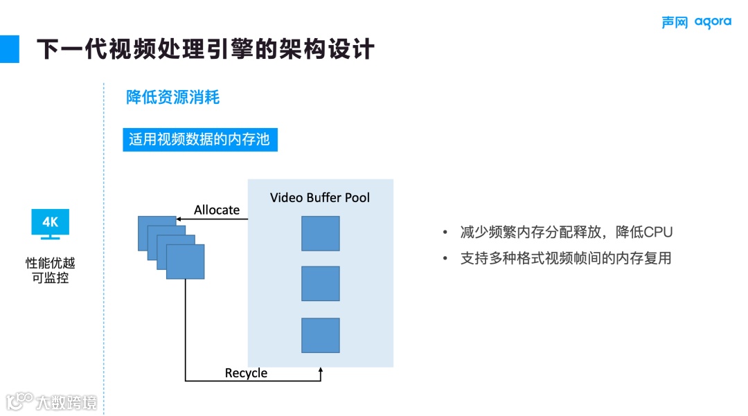 降低系统资源消耗方面,我们构建了适用于视频数据存储格式的内存池,支持多种视频格式的帧间内存复用,同时,可以根据系统内存使用情况和管线负载情况、动态调整达到动态平衡的状态,这样可以减少频繁的内存分配和释放,从而降低 CPU 使用率。