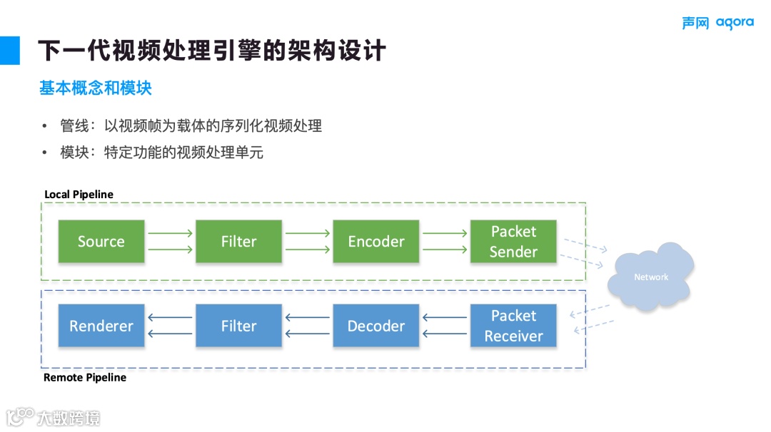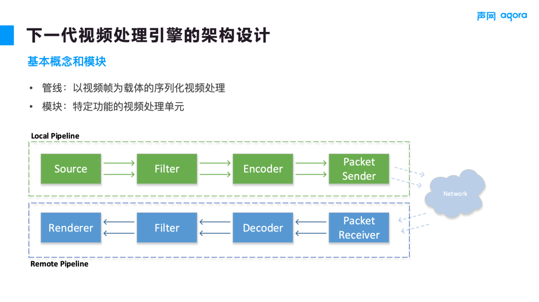 我们看第二个目标,灵活可扩展这一点我们是如何做到的呢?在这之前我简单介绍一下关于视频处理当中的基本概念,视频处理的过程是以视频帧作为视频数据的载体。以本地发送处理流程为例,视频数据被采集之后会经过一系列的前处理单元,然后送到编码器单元进行压缩编码,最后根据不同网络协议通过封装之后发送到远端网络。接收的处理流程是从网络当中接收到视频流后进行解封装操作,送到解码器当中,经过一系列后处理单元后,再到渲染器进行展示。