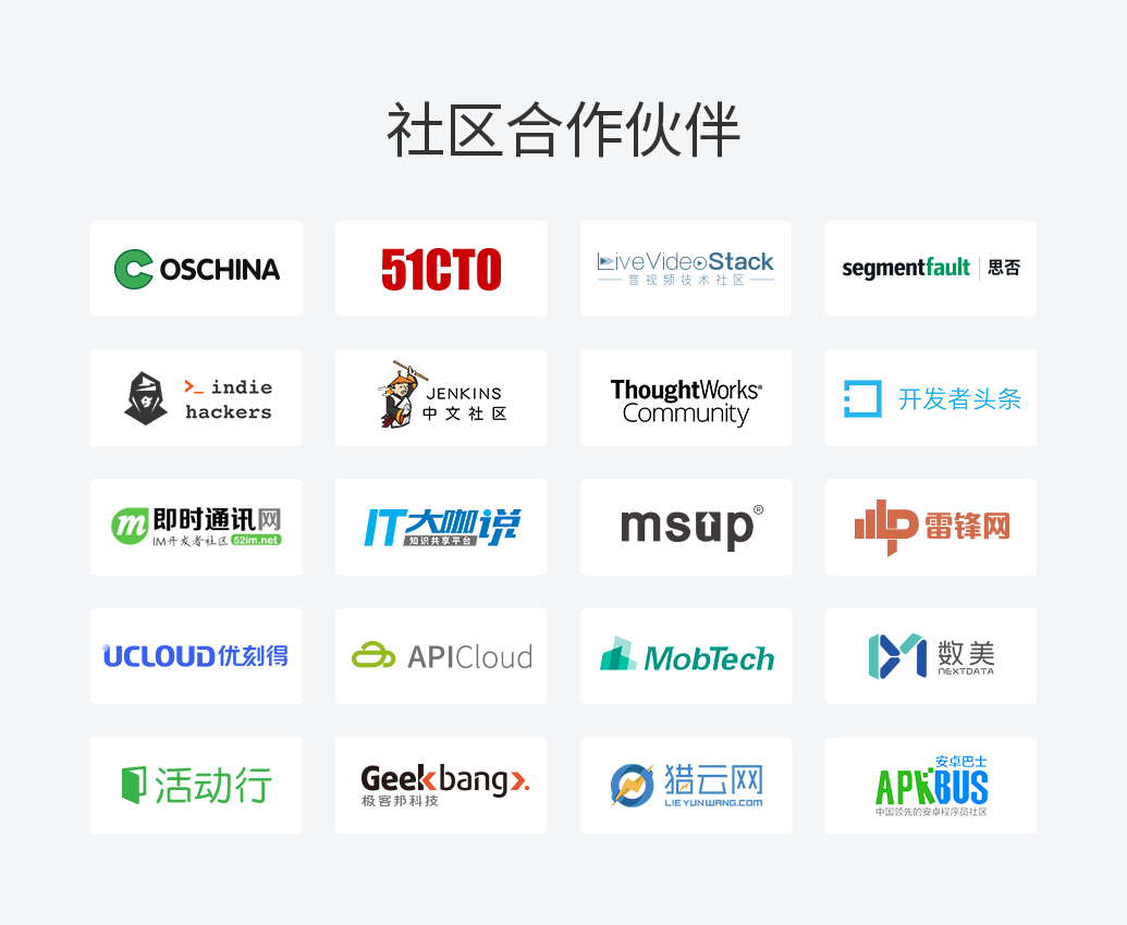 GeekOnline 社区上线初期就已经获得了国内外几十家社区及媒体伙伴的认可并建立了联系,其中包括开源中国、51CTO、SegmentFault、LiveVideoStack、ThoughtWorks 等国内外知名技术社区。