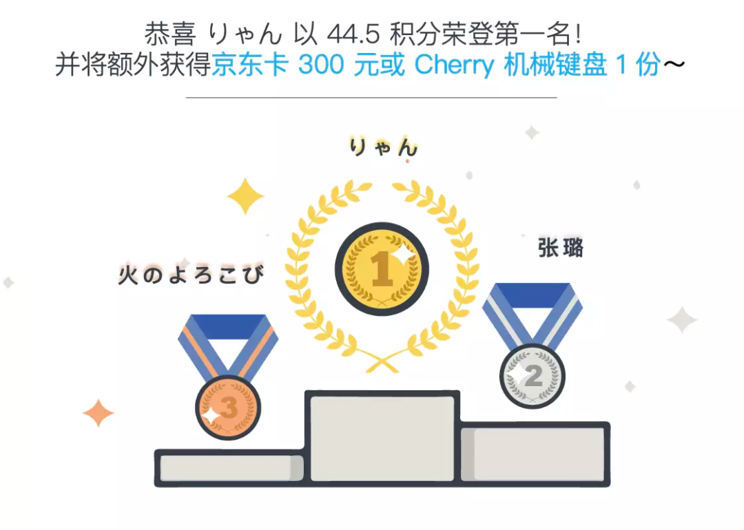 本次活动期间,童鞋们的参与度高达 80%+!参与最终考核的童鞋们最高取得了 97 分的优异成绩,让我们把前 5 名挂出来给大家羡慕一下!