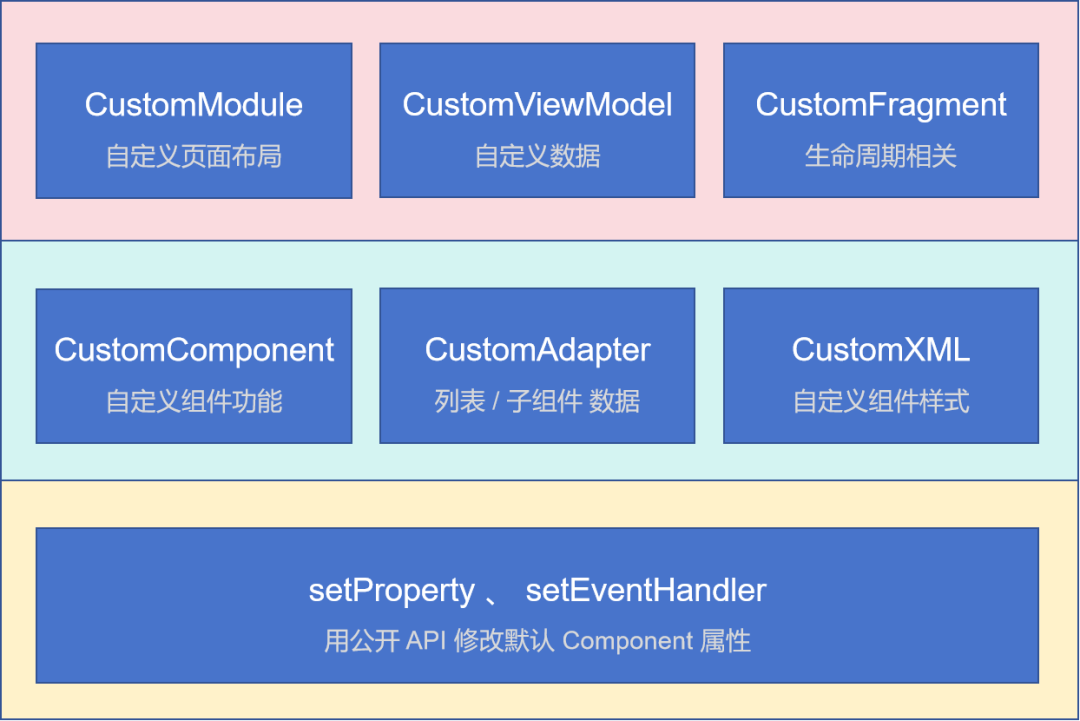 针对整个 Module 和所有 Components,开发者可以根据自己的需要进行重写。重写其中一个区域时,其他区域不受影响,既能够保证功能的可用性,又提供了非常灵活的自定义能力。