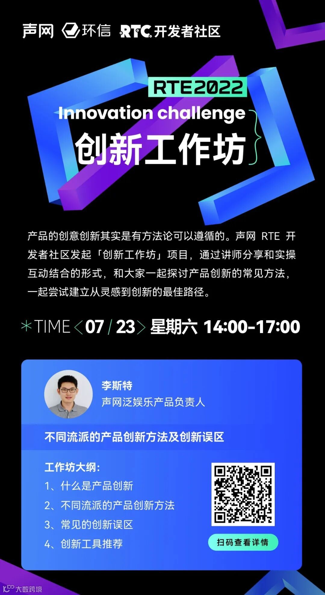 在实际的项目发展过程中,我们了解到很多朋友都有着非常“放飞的想象力”,却缺乏一些完整的思路将灵感进行沉淀。但产品的创意创新其实是有方法论可以遵循的,因此声网 RTE 开发者社区发起「创新工作坊」项目,通过讲师分享和实操互动结合的形式,和大家一起探讨产品创新的常见方法,一起尝试建立从灵感到创新的最佳路径。