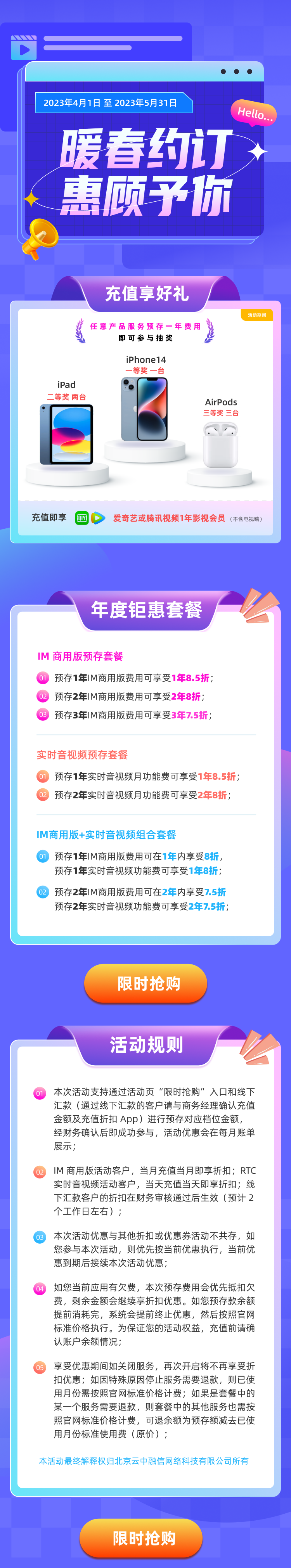2023 年 4 月 1 日起至 5 月 31 日止,IM 商用版提前预存 & IM + RTC 组合套餐低至 7.5 折,RTC 服务提前预存 8 折起。