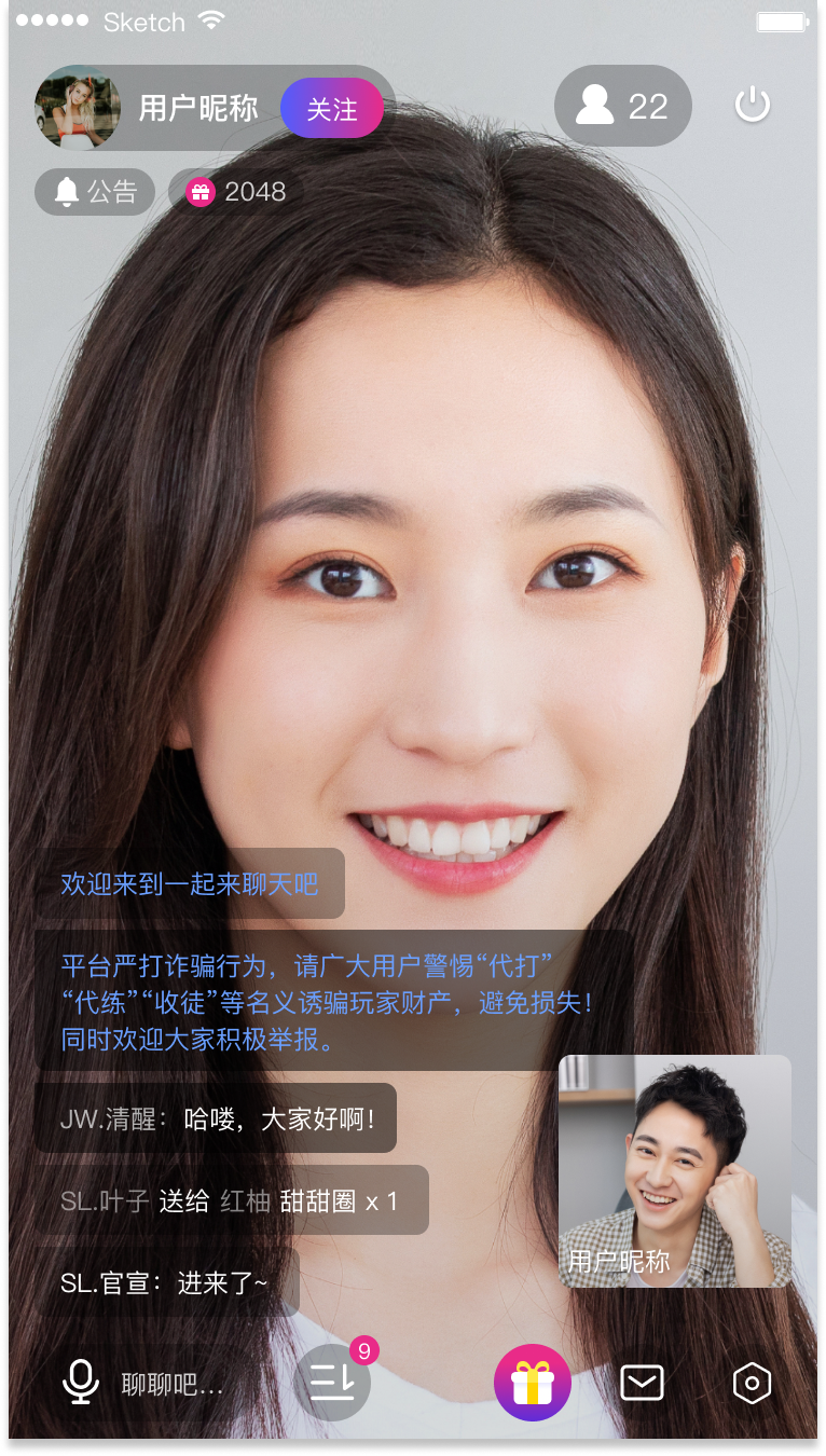 一对一:房主画面全屏显示,连麦用户以浮窗形式显示,画面有遮挡;