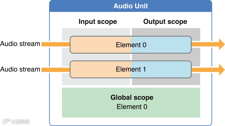 另外,上面的 Input Element 和 Output Element 的数量是相等的,然而不同的 Audio Unit 使用了不同结构,例如一个 Mixer Unit 可能有若干个 Input Element,但是只有一个 Output Element,尽管有不同的结构的 Audio Unit,仍然可以将 Scope Element 延伸到任意的 Audio Unit。