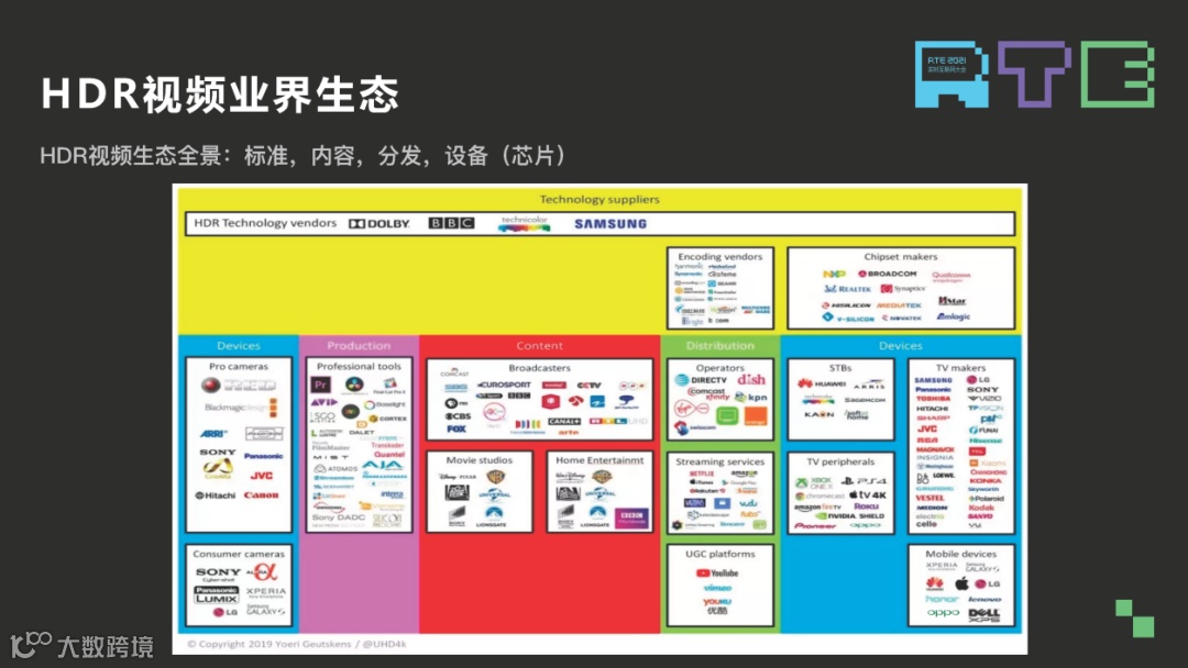上图是一个生态全景图,对于整个生态来讲包含很多厂商,我们的认知生态是以 HDR 视频标准为基础,以前面的内容生产流程为纽带,将各个厂商聚合到一起,共同创造出来 HDR 视频的消费市场。我们比较关心的是流媒体生态,包括内容生产,分发,以及芯片和设备厂商。