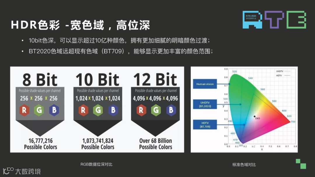 其次是色彩,10bit 编码颜色种类更多,更宽色域能显示的颜色则更多,右边 2020 色域相比 709 大很多,尤其是绿色区域,能显示更多绿色。