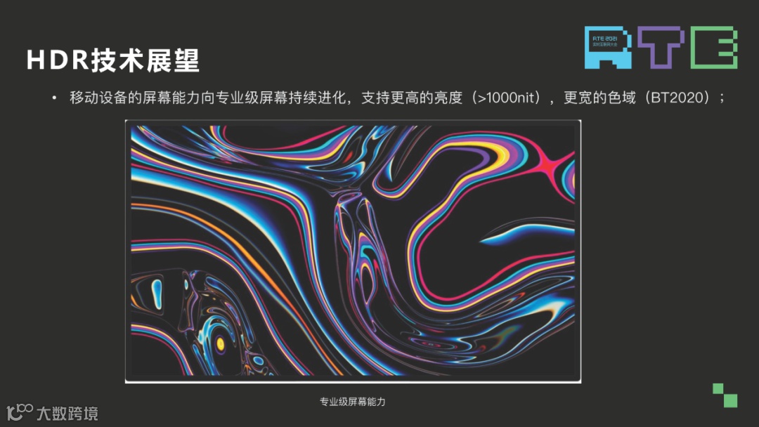 第一,在手机技术发展有一个普遍趋势,硬件能力的小型化和专业能力往移动端迁移,认知 HDR 技术也是遵循这个规律,所以未来首先是手机屏幕硬件发展,目前屏幕普遍支持亮度都是小于 1000 比特的,色域基本都在 DCI-P3,未来可能会出现更高亮度的屏幕以及支持更宽色域的屏幕。这样的话就能显示出更好的 HDR 效果。