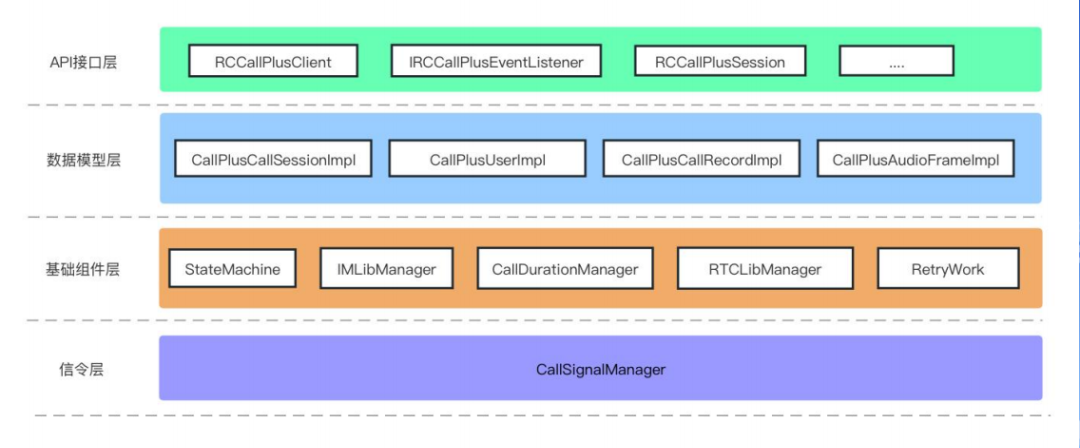 基础组件层封装了 CallPlus 的核心能力,任务模块、通话计时控制模块及 RTC SDK 和 IM SDK 的封装模块都在该层实现。
