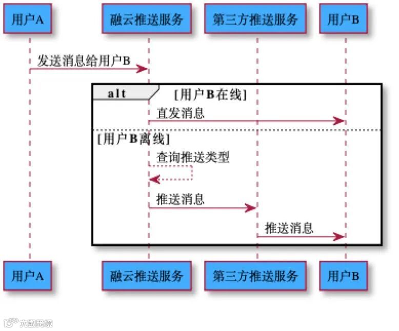 融云推送服务接收到一条消息后,若目标用户离线,则根据协商过程中所使用的推送类型,将消息推送给对应的第三方,第三方推送服务通过自己的系统级推送通道,将消息送达到目标用户设备,并在通知栏展示。