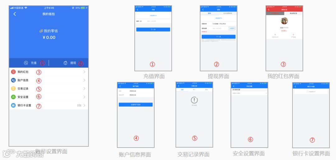 ⑦ 如下图所示,钱包功能可以查询用户的账户、红包信息以及交易记录,此外也添加了安全设置来保护用户的信息和资金安全。