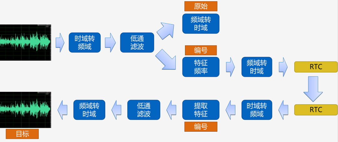 如图 7 为我们的音频对齐方案:拿到音频信号以后,先经过时域转频域,进行频域的低通,只保留 4K 以下的人声,4K 以上的则作为打入特征码,把原始信息留存,以备后续与目标对比。编完码以后再转成时域给 RTC ,RTC 进行时域转频域,进而经过提取就能取得音频编号,最后通过低通滤波,再转成原始的声音。