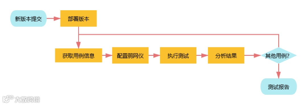 如图 12,自动化验证的流程为:研发人员更改编码、网络等特性后进行新版本提交,先是在验证环境中部署版本,获取用例信息、配置弱网仪、执行测试过程、分析结果。如果发现其他用例,会不断循环执行,最后生成报告。