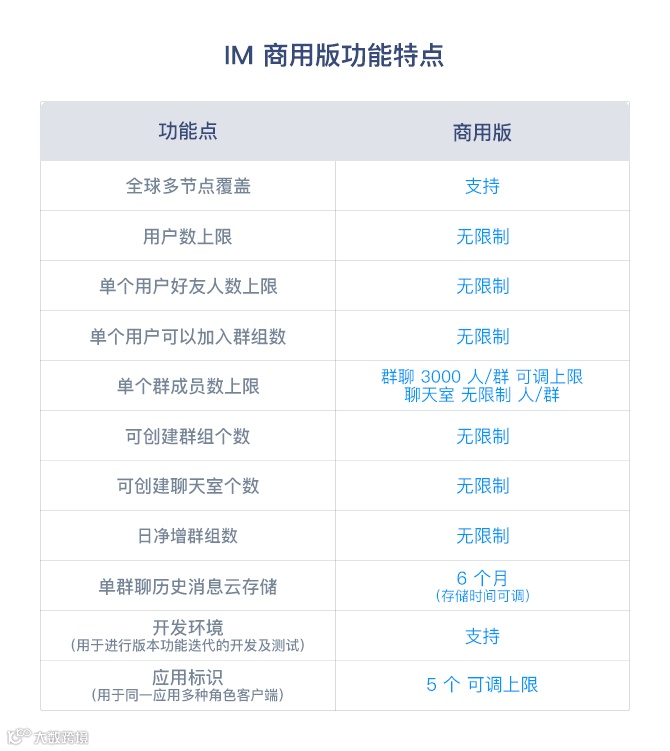 第一,功能丰富不设限。用户数无上限、创建群组无上限、好友人数无上限,聊天室人数无上限,单个群的群成员上限 3000 人,并且还可根据客户需求再进行上调。