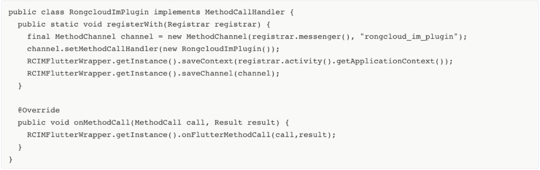 (1)继承 MethodCallHandler 并设置 Handler ,MethodChannel 需要保存在对象一会调用回调时需要使用,onMethodCall 为 Flutter 层回调的方法这边用 RCIMFlutterWrapper 承接处理。