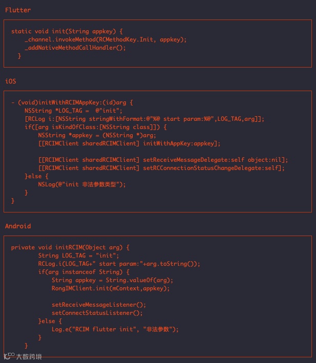 Flutter 通过 MethodChannel 与 iOS/Android 进行交互,下面的代码展示了三个平台如何创建 MethodChannel 对象。