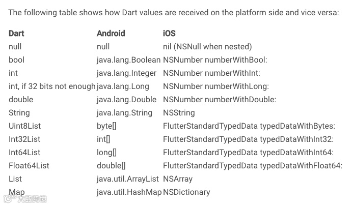 上面这张表罗列了 Flutter 使用的 Dart 语言与 iOS/Android 可以传递的数据类型,从表中我们可以看到,它只能传递一些基本的数据类型,比如 bool,int,double,高级的就是 String,List,Map,而且表中指明了在各平台对应的数据类型转换:如 Dart 的 Map 对应 Android 的 HashMap,对应 iOS 的 NSDictionary 。