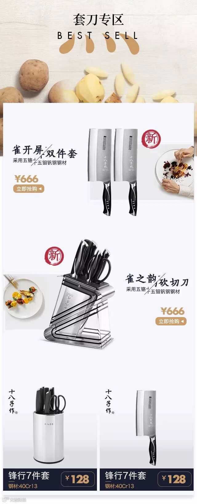 在研究十八子产品详细资料和定价后,我们发现几个问题:1.相似价格的产品太多,导致销量聚集在最好看的产品上;2.不同的钢材相同价格;3.产品性能、重量和价格没有逻辑关系;4.刀具外观无法呈现价格档次。针对这些问题我们作出以下解答: