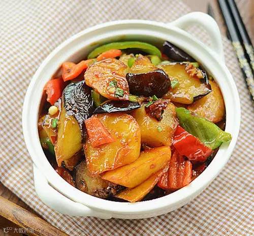 4、以少量热油爆香葱花及蒜茸,加高汤、生抽、糖、盐、茄子、土豆和青椒块,略炒。....