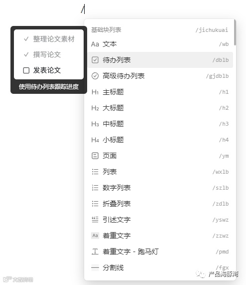 这里还有个小细节,因为“/”和中文输入法的顿号“、”是同一个按键,因此Wolai在中文输入法下,一行开始处输入顿号也可以唤起快捷操作。
