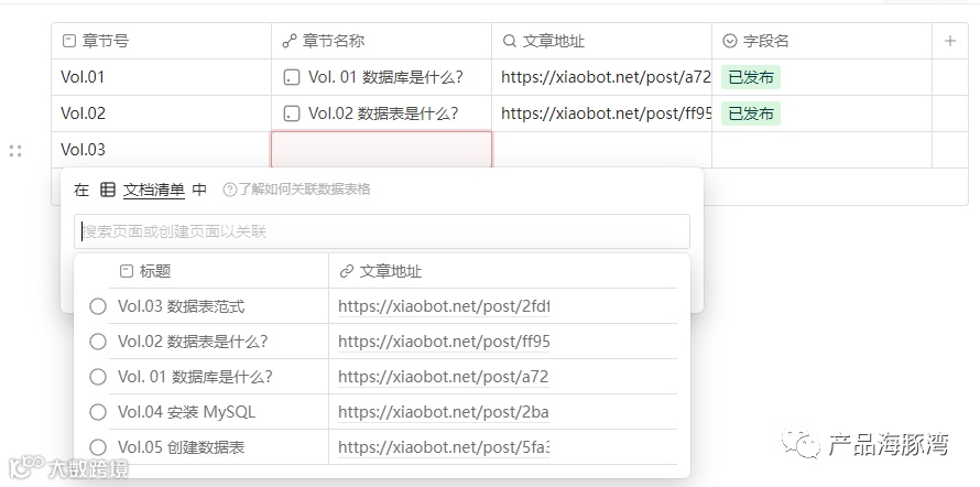 数据表格有点像是弱化的飞书多维表格,比如也支持自定义字段,关联其他表格数据,然后通过引用类型字段可以引用关联数据表的字段。这个引用和多维表格的有些差别,只能引用已关联数据表的字段,而不是可以引用其他数据表的单选数据。