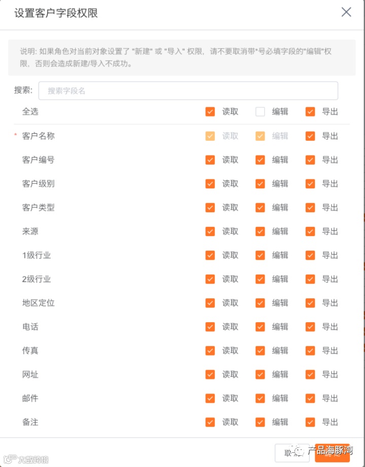 字段的操作一般只有读取、编辑和导出,因此字段操作上不需要单独管理。下面同样给出了纷享销客的字段授权的界面,供大家参考。