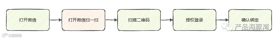 从打开微信到最后的确认绑定,一共需要6个步骤,而且还有两个步骤是需要用户主动搜索(搜索小程序和找到内置扫一扫功能)。这种效率是非常低下的,体验也十分糟糕。这就暴露了产品经理不熟悉微信生态二维码的问题,实际上,我们见过的步骤一般都是下面这样。这里只有打开微信扫一扫是需要用户主动操作的,其他都是一路点下去就能完成的操作,操作上不会存在中断,而微信扫一扫是用户早已养成的扫描习惯,效率和体验比使用内置的扫一扫好太多。