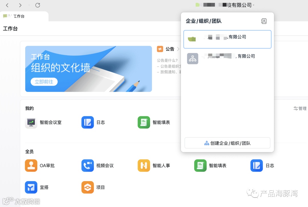 这里的关键是你要使用某个企业(或团队,以下我们统一称为租户)下的功能,首先你需要被邀请加入某个租户。而且,一个账号可以被邀请加入多个租户。如果你属于多个租户,那么和某个租户相关的操作你需要先切换到该租户下才可以使用。比如我们的工作台、云盘这些就和租户有关,下面的图就是钉钉的工作台,默认会有一个租户,可以通过下拉方式切换租户。