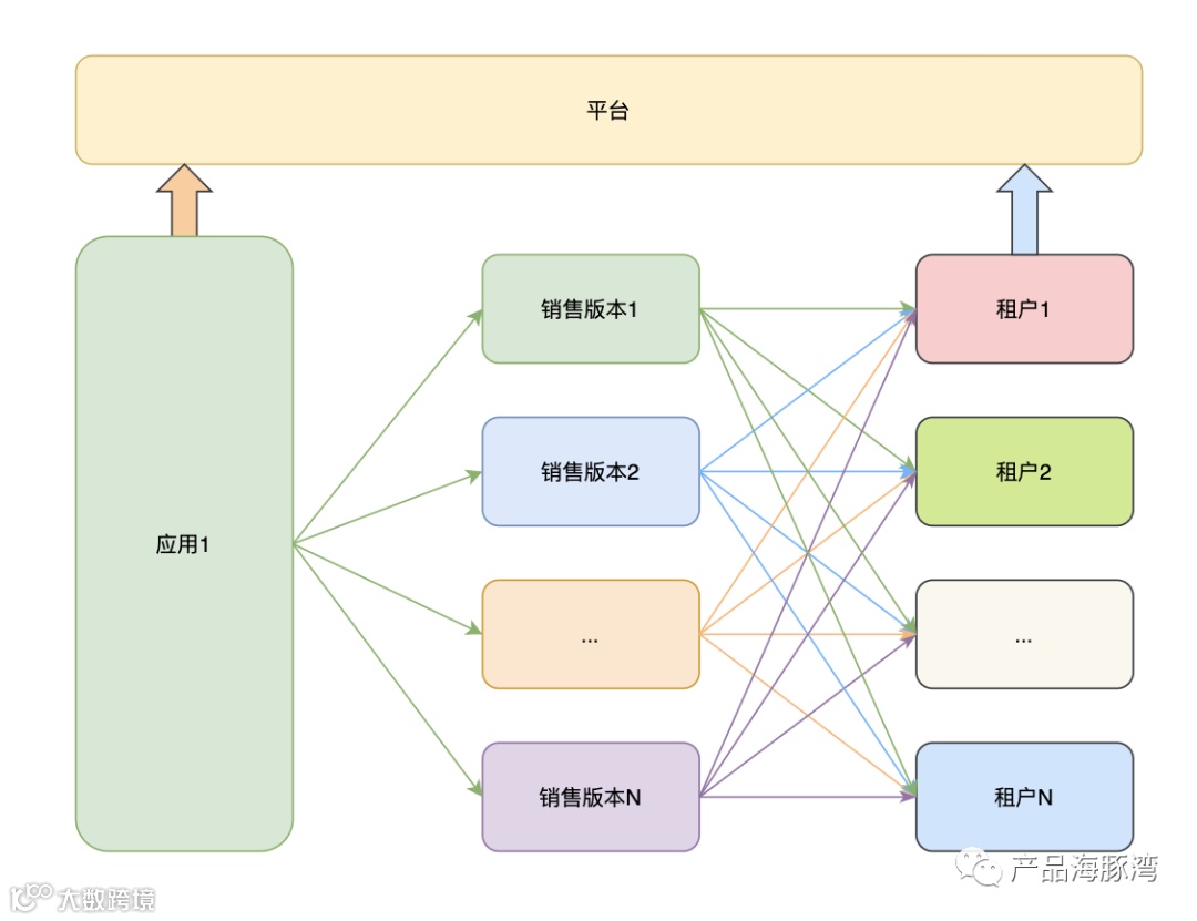 租户属于1个平台,租户可以根据自身需要订阅多个平台下的应用的某个销售版本。