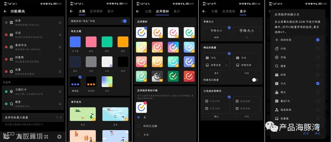 国内大部分的C端产品都支持用户个性化配置,典型的就是所谓的皮肤。在个性化方面,滴答清单更进一步,可以做到如下内容的个性化,有些还是挺高级的。