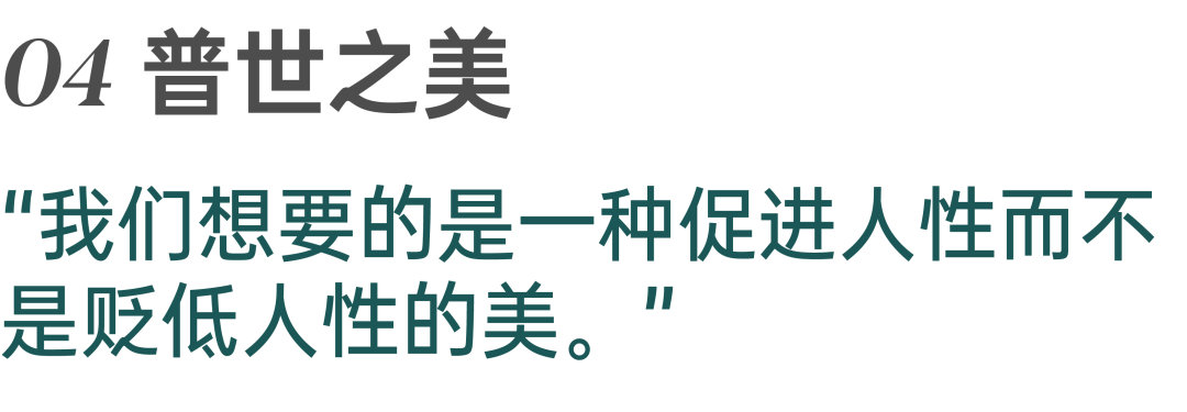 还有就是一种促进人性而不是贬低人性的美。举个例子,如果设计女装是为了取悦男性,为了让男性看得懂,然而女性本身并不喜欢,这就不是美。就像道德一样,道德跟价值观是两码事,人和人有不同的价值观,但道德一定是具有普适性的。找到道德的基准,这很关键。