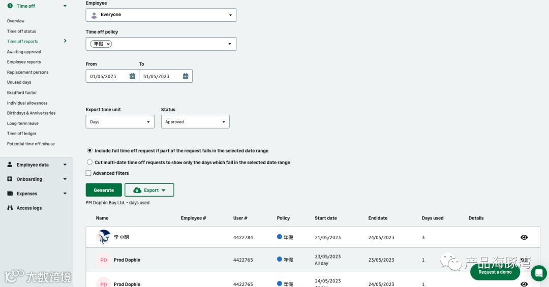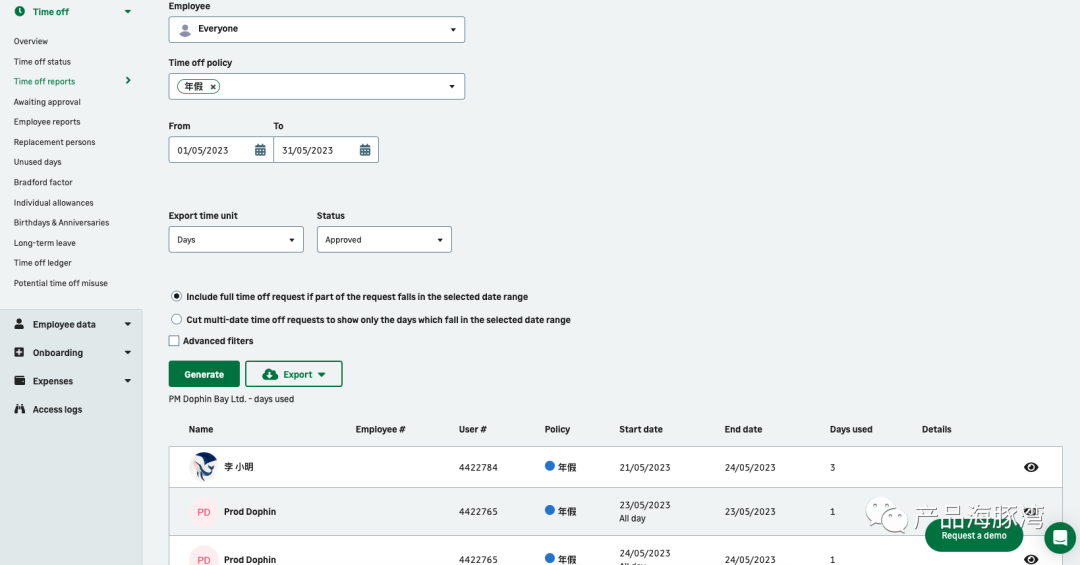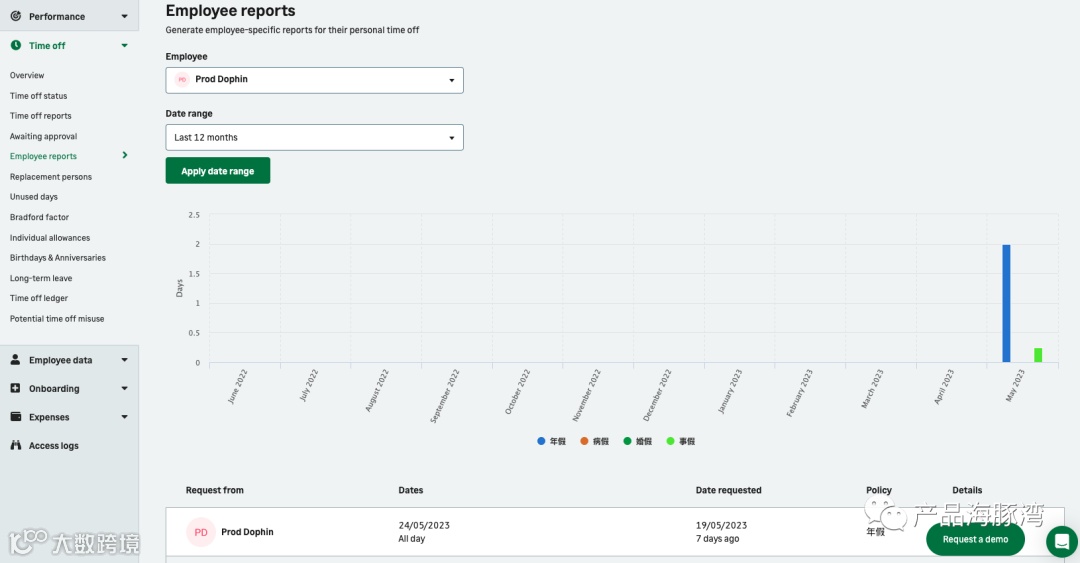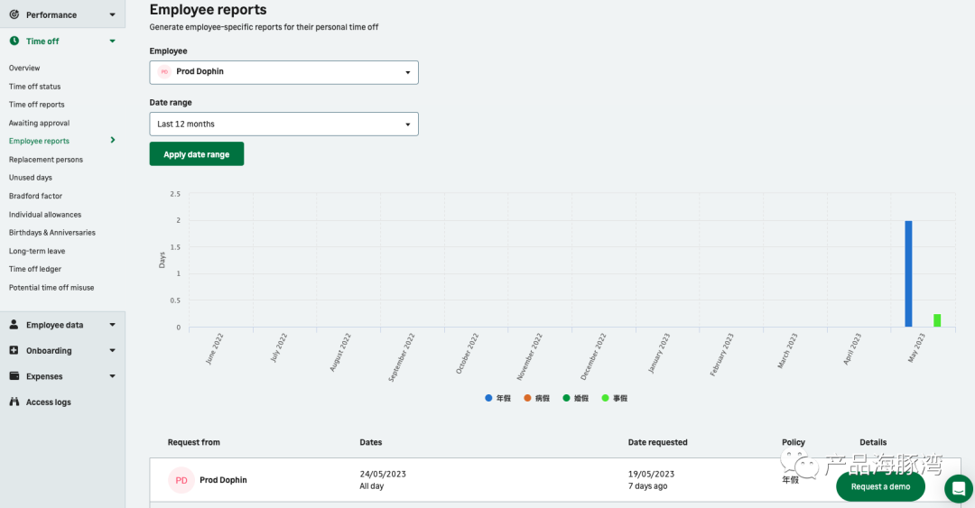 潜在假期滥用分析:即对于有些异常的请假行为进行分析,列出可能的滥用行为,比如我测试的一周内请了两次年假就被分析了出来。这个其实也可以在某些方面反映员工的积极性。
