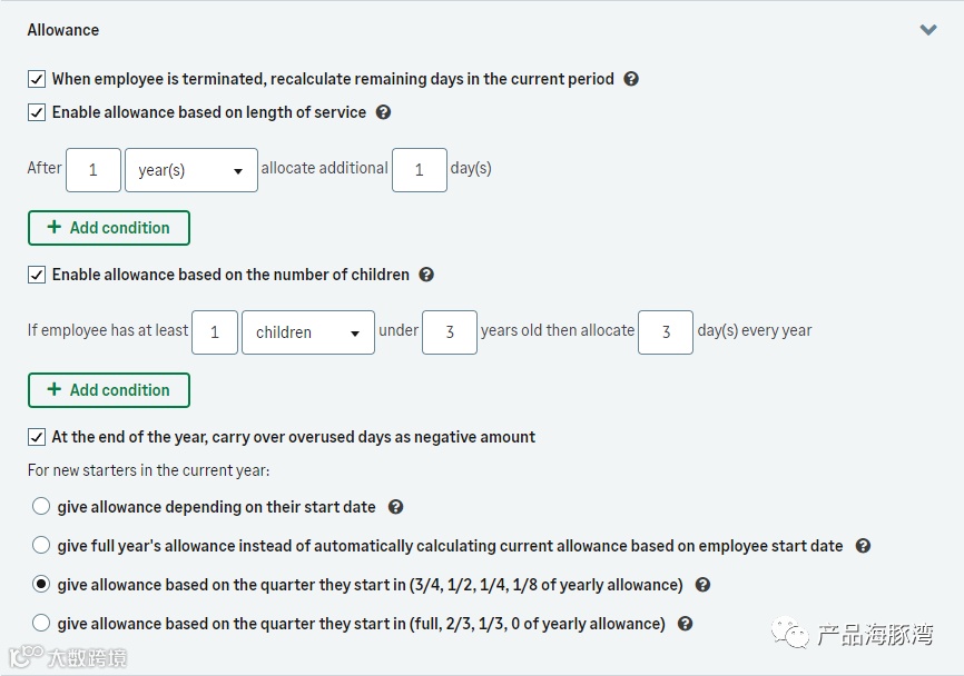 休其他假时当前假期是否可以累积(Do not accrue when taking leave from one of these policies):这个有点难理解,举个例子,假设我们按照员工入职时间发放年假,如果设置了请病假时不累积年假,这期间员工请了3天病假,那么他下一次的年假发放就需要往后延长3天。