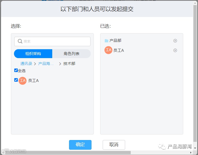 这里我们看一下发起人范围设置,这一点上钉钉的设计非常灵活,选择范围支持按部门+人员混合选择,即同时允许某些部门和某些人发起某项审批。通过这种灵活的组合,可以满足各种各样的发起人限制,从而支持企业的个性化需求。