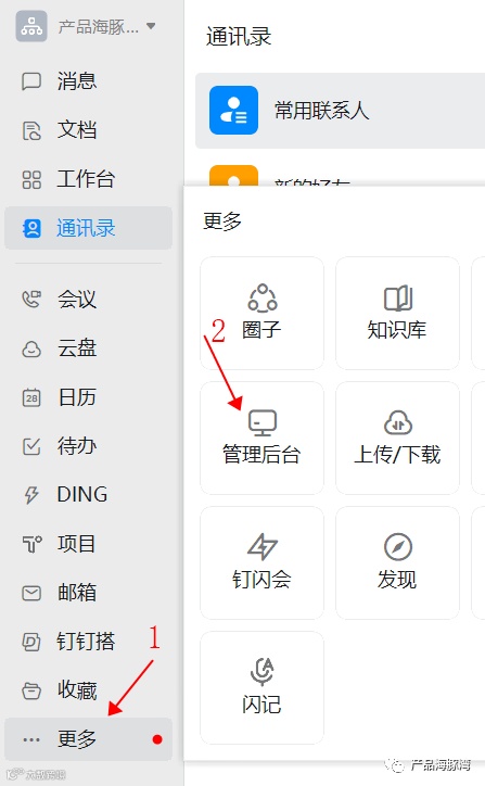 进入管理后台:PC版钉钉左侧菜单栏点击“更多”,选择“管理后台”即可自动跳转到浏览器,选择刚刚创建的团队即可进入到管理后台。也可以在浏览器访问钉钉的管理后台网址oa.dingtalk.com,扫码登录后进入管理后台。