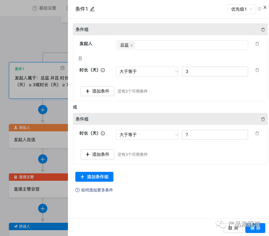 条件组合:条件组合分为同时满足(且条件)和任一满足(或条件)。钉钉的且条件使用组内条件,即在统一条件组内的条件需要同时满足。比如我们可以组合发起人角色和请假时长这两个条件来决定是否要呈报总经理审批,如发起人角色是总监且请假天数大于3天需要总经理审批,否则只需要总经理助理审批。钉钉的或条件通过添加不同的条件组实现,不同的条件组只需要满足其中一个条件组即可。