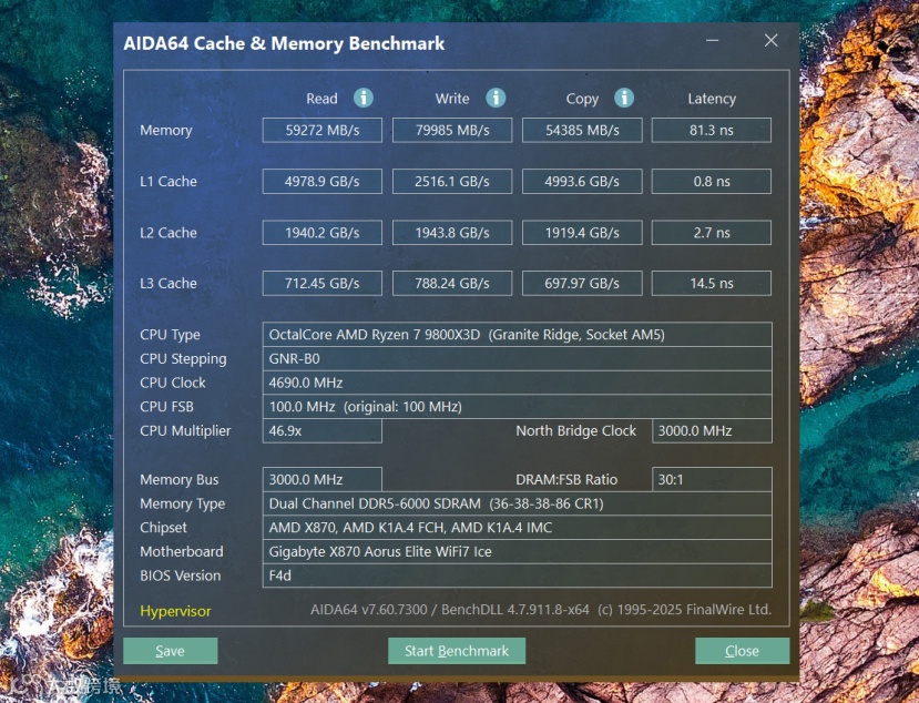 刚好之前在X870E+9800X3D平台测试过6000CL28频率海力士A-die颗粒内存产品,同样开启技嘉高频宽下进行测试对比。