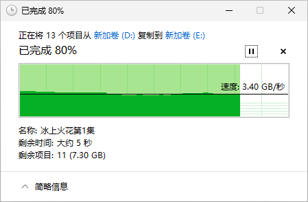 再来看看实际传输场景,这里我把36.6G的电影从D盘拷贝到金百达KP270的E盘,它的平均速度稳定维持在3.40GB/s上下。从上面的图示中也能够清晰地看到,其速度曲线基本平稳,整个过程直至后期都没有出现掉速的情况。