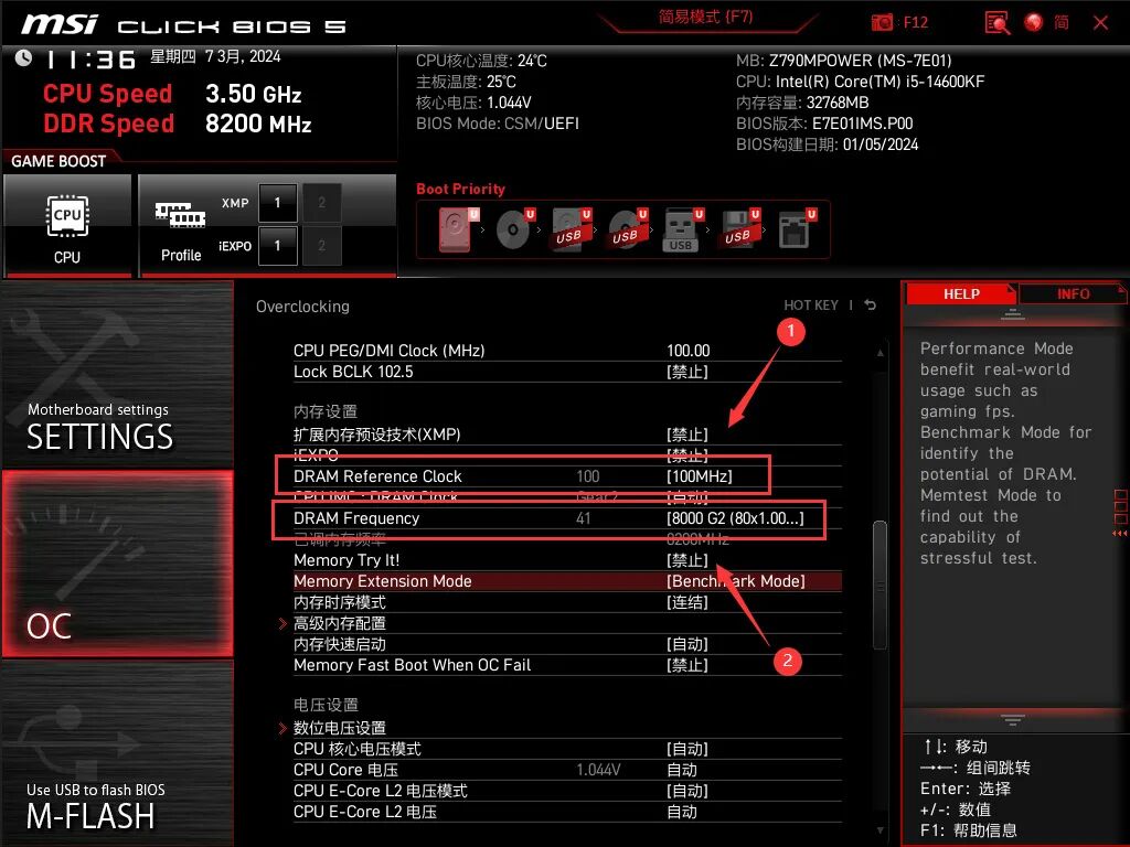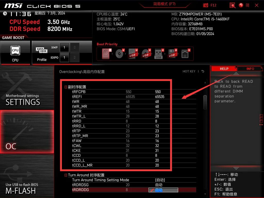 微星Z790MPOWER的宽容度仅限8000MHz频率,再高就得看脸了,电压调教需要比较细致,这里放一下8200MHz预设作为参考,照抄大概率没用,第一步修改内存频率: