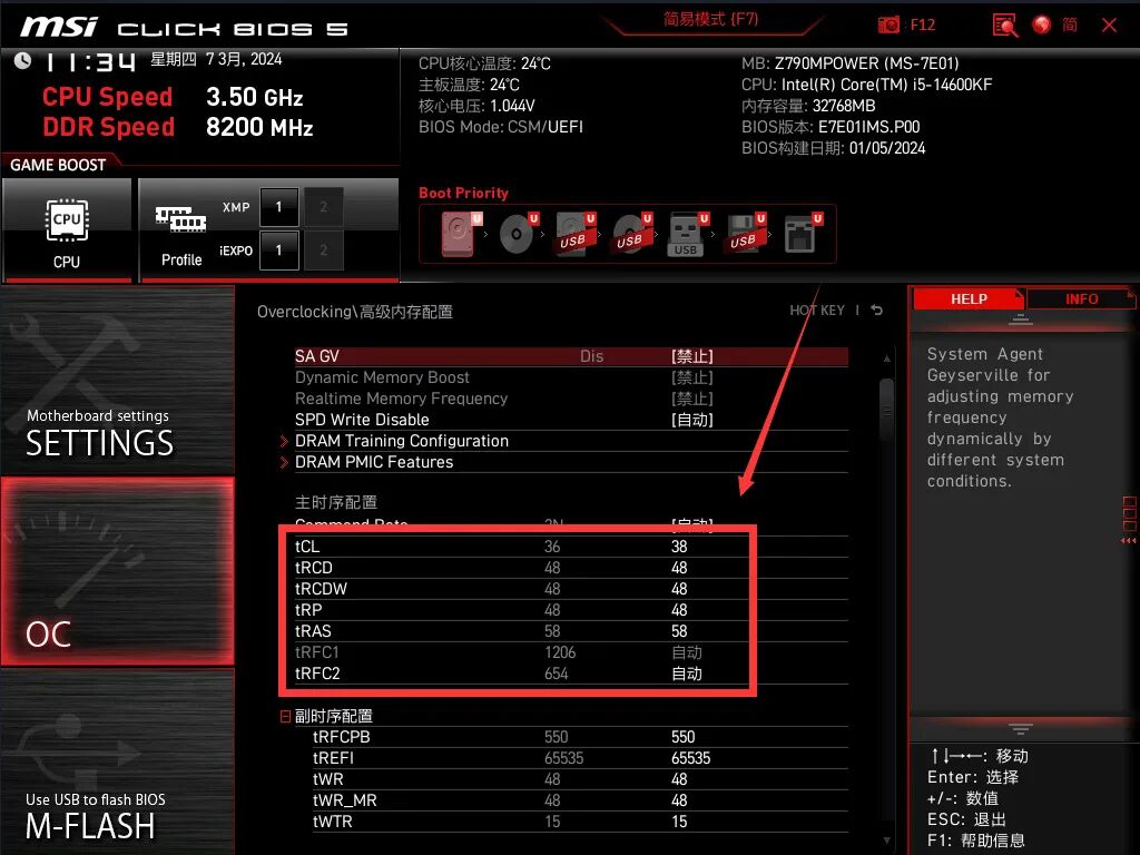 理论上单颗粒3G的24G单条内存应该比单颗粒2G的16G好超点,问了下同样在测试微星Z790MPOWER的玩家朋友,这张板子可能区别没那么大,优化还是集中在16G+8000MHz。