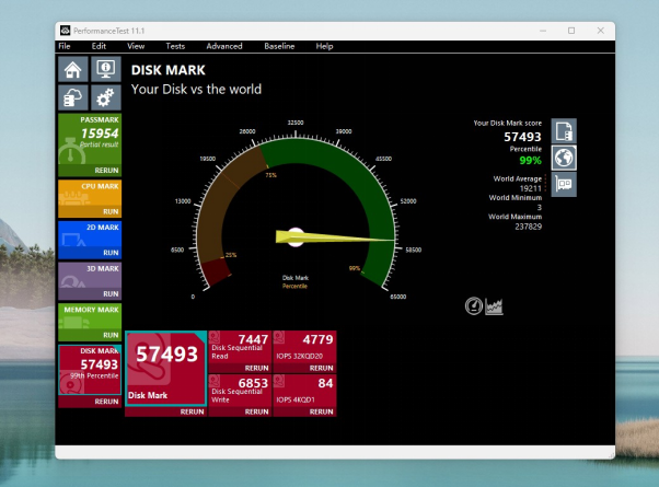 Performance Tes硬盘测试,总分高达57491,超过了99%的硬盘。