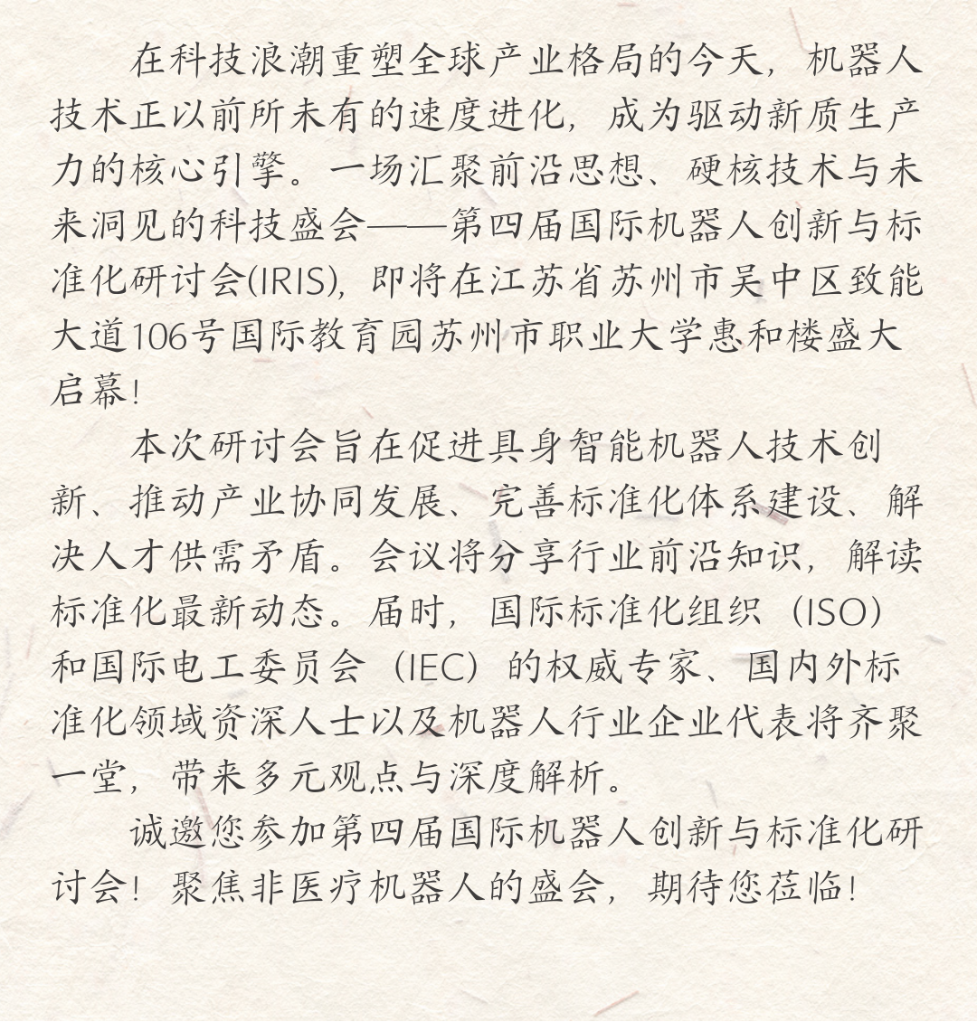 具身智联・人机共融:第四届国际机器人创新与标准化研讨会(IRIS)