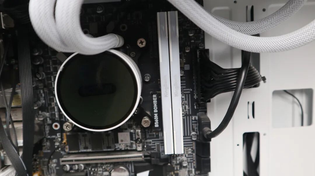 内存条依次插入主板内存插槽内,可以看到这款内存条的RGB灯条亮起来,而且我的机箱是白色的和水冷、内存特别搭配。废话不多说,咱们上几张安装好的图片看一下效果。