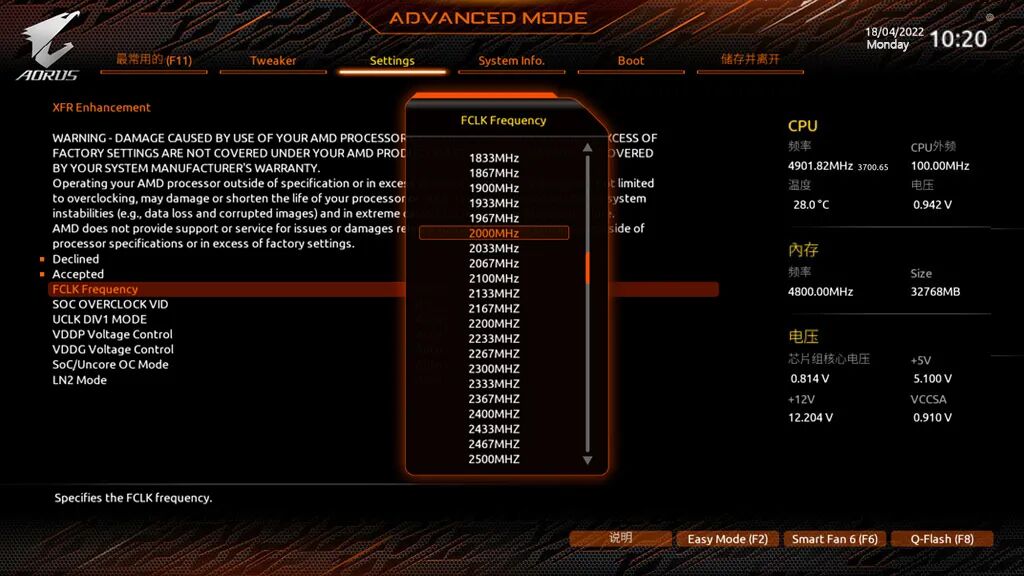 值得注意的是,当内存超频至4800MHz或者更高的时候,有可能会有内存分频的情况出现。这里我们需设置FCLK,当然设置此目的是为了FCLK的频率和内存的频率保持一致,这样才能保证内存性能正常发挥。技嘉主板的BIOS设置FCLK步骤如下:Settings-AMD CBS-NBIO CommonOptions-XFR –Enchancement-FCLK Frequency。一般情况FCLK参数是内存频率的一半,比如4800Mhz频率,FCLK则需要设置为2400,以此类推。