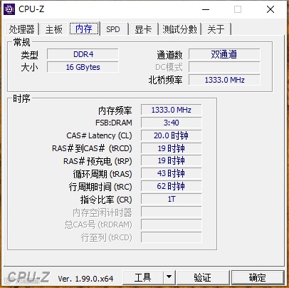 开机后CPU-Z查看下时序是C19,Fclk是1333MHz,CR 1T,没有分频。