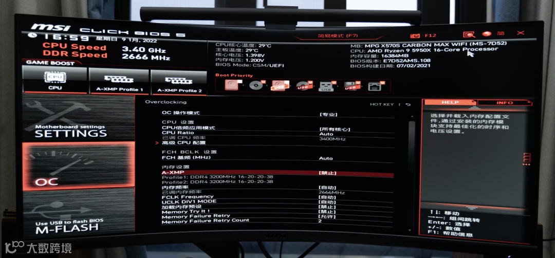 测试平台用的是目前AMD的顶配,5950X+X570S暗黑,5950X的FCLK可以到2000Mhz,用来测试金百达内存超频完全够用,微星主板的内存超频优化更是出色易用。顺带晒一下。